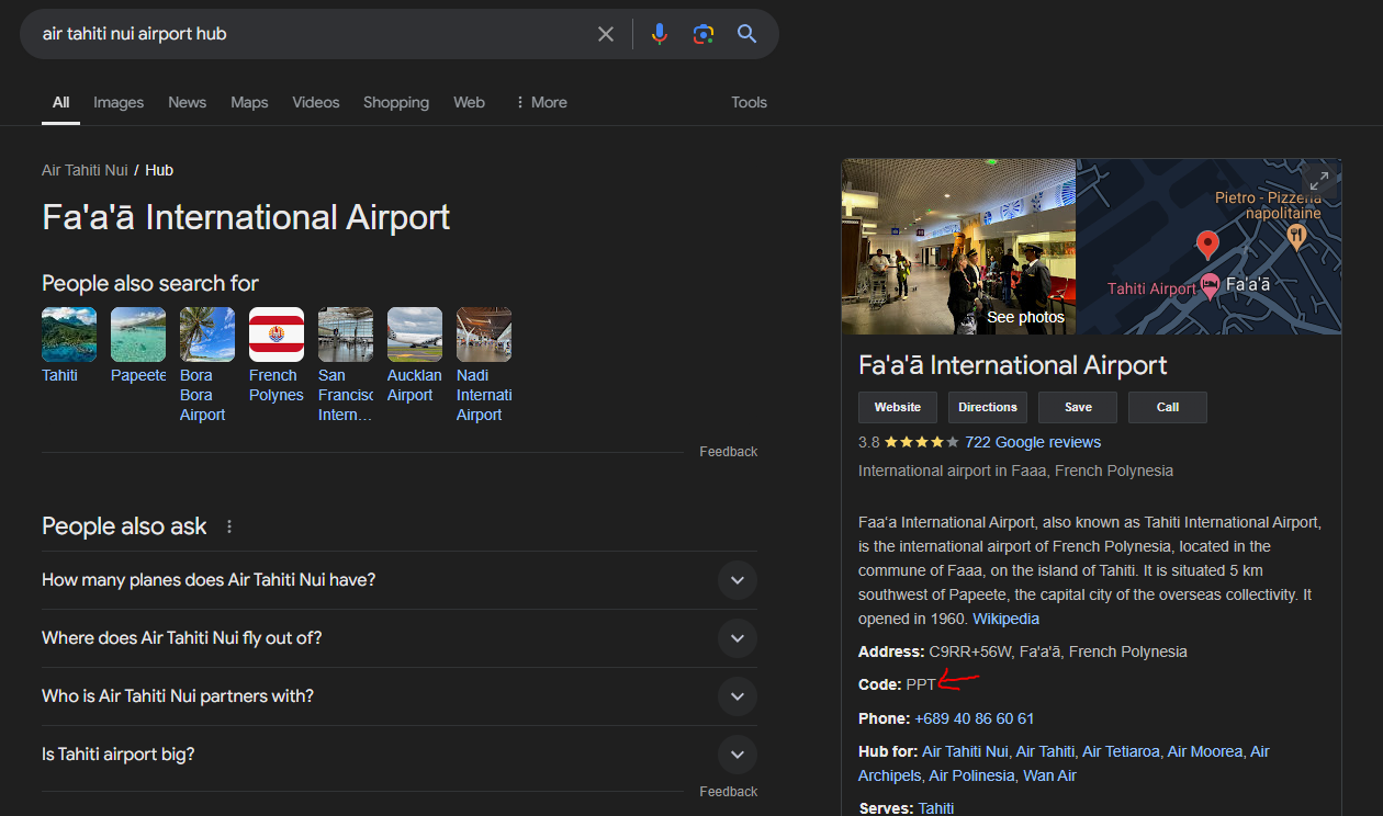 8) Based on the Google result, it show Fa'a'ā International Airport and it also show the code for the airline, which is PPT.