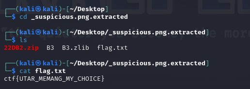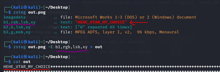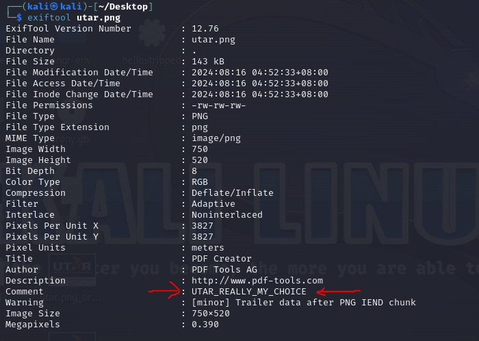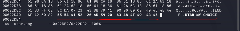 One interesting feature of the PNG file structure is that you can append additional data after the IEND block without affecting how the image appears. For example, you can add the text UTAR MY CHOICE or even entire other files at the end of a PNG file. When you open the image in a viewer, it looks the same, but the extra data remains hidden.