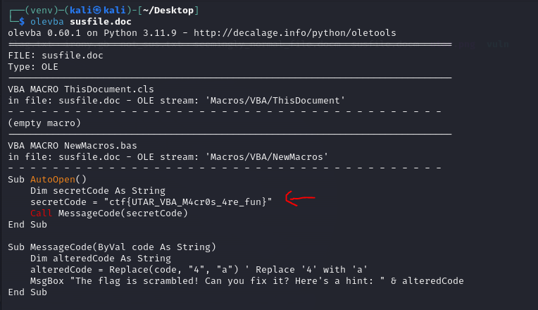 VBA (Visual Basic for Applications) macros are scripts embedded in Microsoft Office documents (like Word, Excel, and PowerPoint) that can automate tasks but can also be used to carry out malicious activities. In CTF, you may encounter documents containing hidden or obfuscated VBA macros, and your task is to analyze these macros to uncover hidden information or understand the malicious behavior.