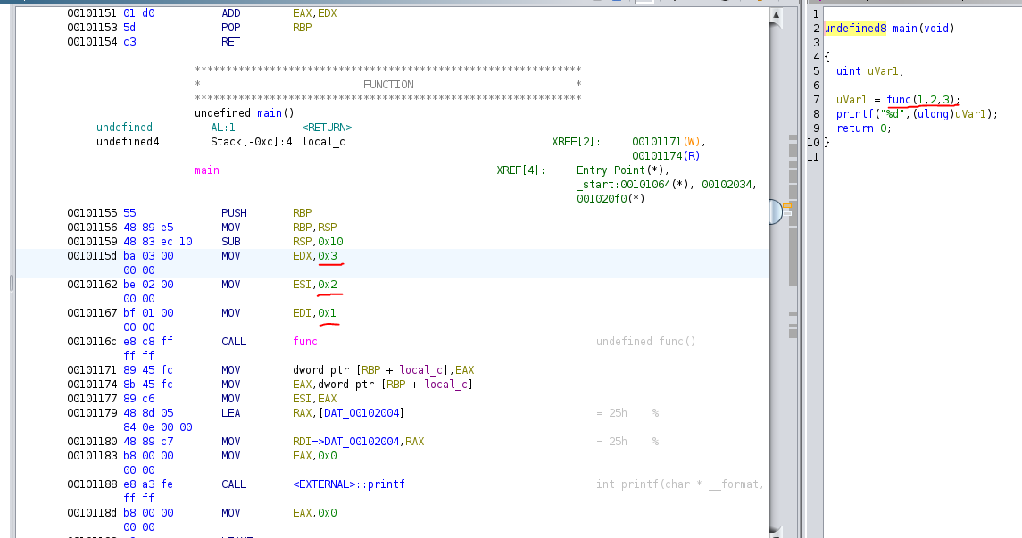 This sequence pushes each argument onto the stack, starting with the last one (arg3) and ending with the first one (arg1). The call instruction then invokes the function func. You can see it in Ghidra as shown below.