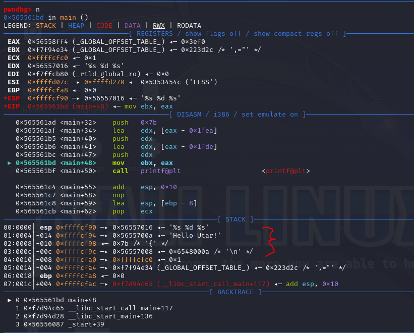 When disassembled using a debugger like gdb-pwndbg, the instructions show how parameters are pushed onto the stack before calling printf().