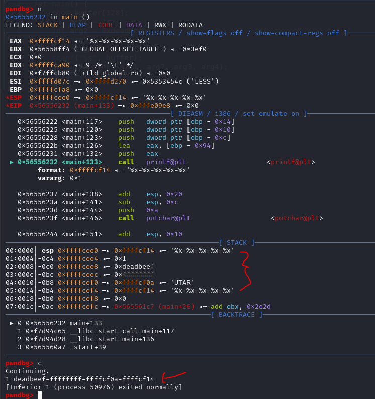 As we can see, the address of the format string 0xffffcf14 is located right before the parameters arg1, arg2, arg3 and arg4.