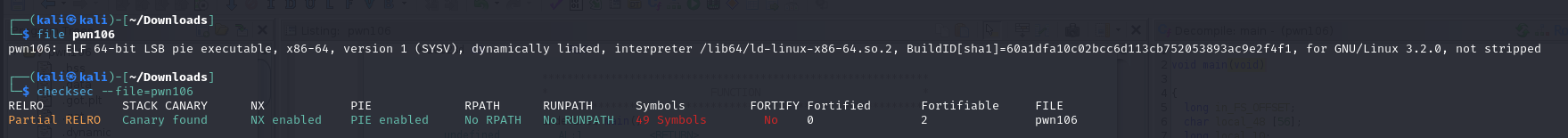 Based on file and checksec, we can see that it is a 64-bit binary with almost all protections enabled.