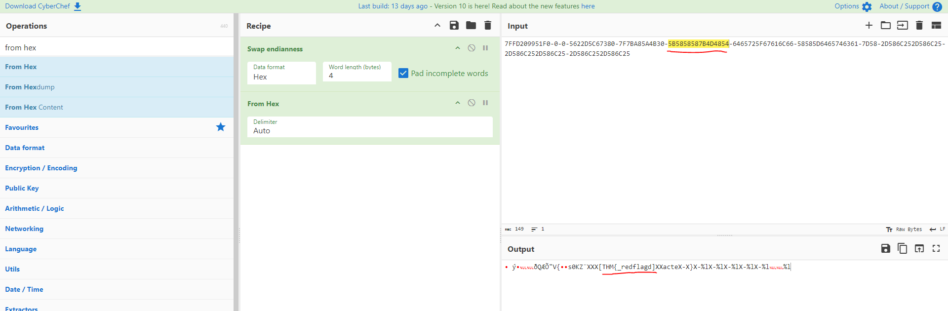 Now, let us see whether the flag is presented on the stack or not. One fast way is to use cyberchef to swap the endianness and print to ascii format.